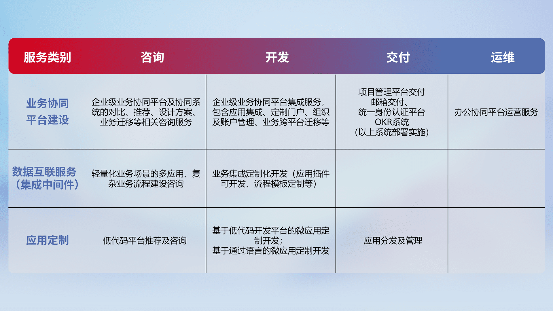 针对钉钉、、、企微、、、、IDaas等平台级产品提供产品的规划、、方案、、、交付、、、定制化开发等服务,,,实现如统一协同办公、、智能客户服务、、混合会议管理、、、智能数据查询、、、、等业务场景,,,实现数字化转型。。。